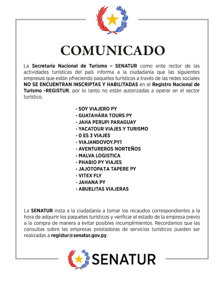 El comunicado de Senatur.