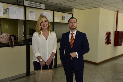 Mercedes Menchi Barriocanal y su abogado Harry Biedermann tras la suspensión de la audiencia de conciliación con Juan Vera por querellaGustavo Machado ABC COLOR