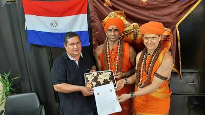 Ezequiel Ayala Rodríguez, intendente de Karapa'í, Amambay, con los supuestos representantes de los Estados Unidos de Kailasa. De fondo, las banderas de Paraguay y del estado inexistente.