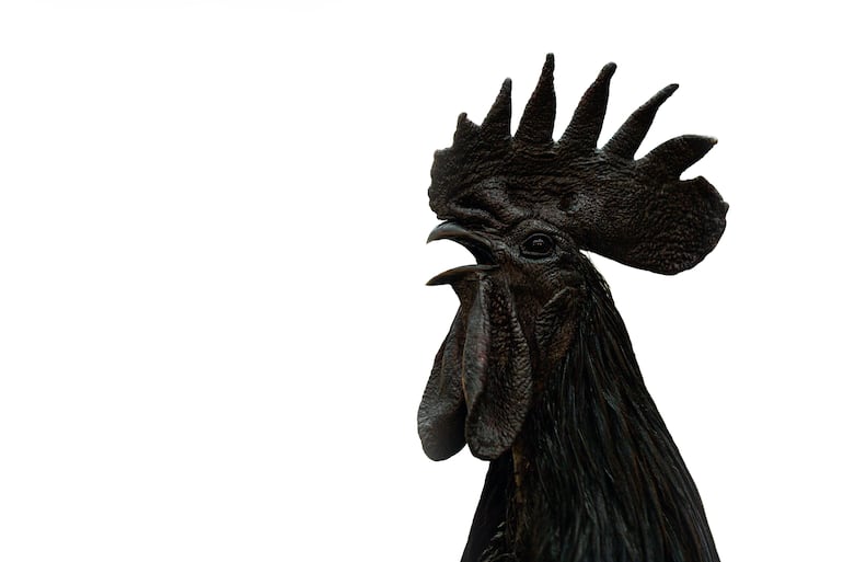 A primera vista parece una criatura salida de una fábula: plumas negras tornasoladas, cresta y patas oscuras, piel, músculos e incluso huesos de un color que va del gris carbón al ébano brillante.