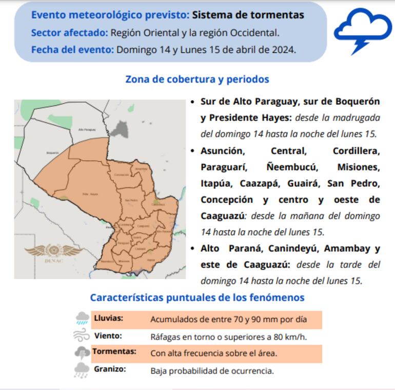 - Desde la mañana del domingo hasta la noche del lunes: Asunción, Central, Cordillera, Paraguarí, Ñeembucú, Misiones, Itapúa, Caazapá, Guairá, San Pedro, Concepción y centro y oeste de Caaguazú.