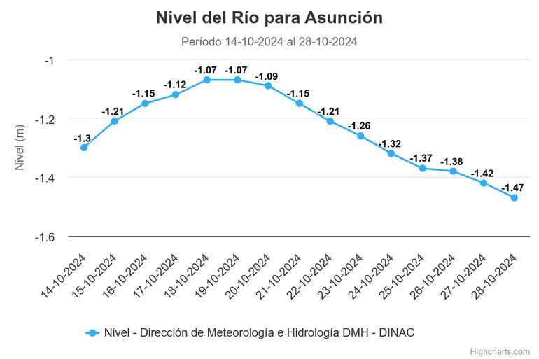 Desde entonces, el río viene registrando un descenso sostenido, lo que había establecido la nueva marca mínima histórica, de -1,43 metros de altura, el pasado el 7 de octubre.