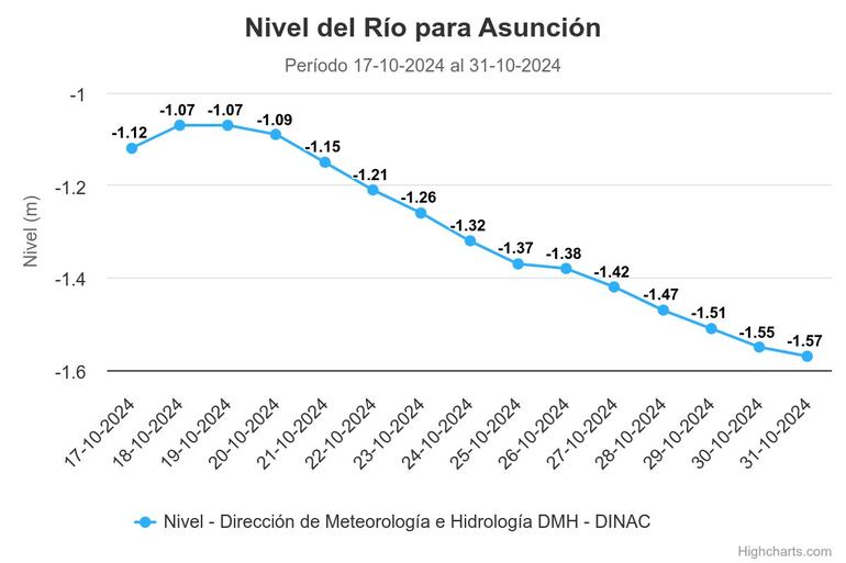 Este jueves 31 de octubre, el río Paraguay en Asunción volvió a tener un registro mínimo histórico: -1,57 m. Según el reporte oficial, con los dos centímetros de hoy, ya se completa un descenso de 10 cm en solo cuatro días.