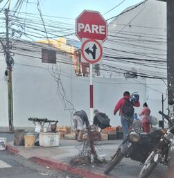 En la esquina de la calle Yegros y 25 de mayo se encuentra un cartel de “Pare” enredado con varios cables, algunos aparentan seguir conectados o al menos colgados por el tendido eléctrico.