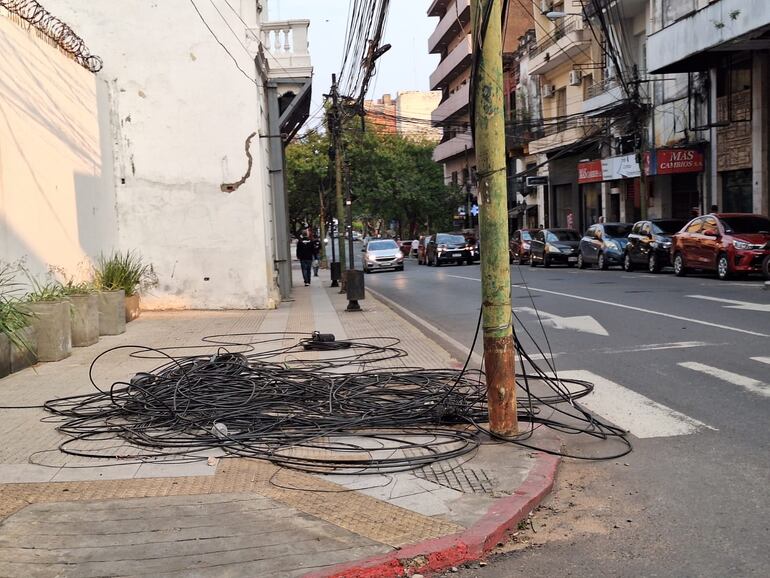 Los cables se encuentran abandonados en el mismo sitio desde hace al menos cinco días, sin que ninguna institución se haga cargo, ni siquiera la Municipalidad de Asunción, que ya tiene acostumbrado a sus ciudadanos a vivir en una ciudad sucia y descuidada.