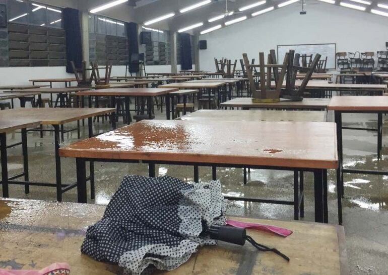 Los numerosos agujeros que tiene el techo de su aula hacen que llueva “más adentro que en el exterior”. Pese a los constantes reclamos que elevan, los directivos hacen oídos sordos.