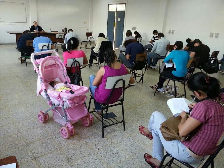Una alumna de la cátedra de Derecho de la Niñez y Adolescencia en la Facultad de Derecho y Ciencias Sociales a cargo del Dr. Guillermo Trovato Pérez, Filial Quiindy de la Universidad Nacional de Asunción, en pleno examen con su pequeña hija.