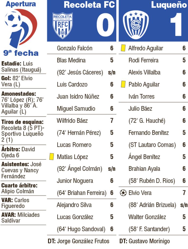 El Sportivo Luqueño, si bien no fue superior en el juego, supo aprovechar sobre los últimos minutos del partido el descuido de Recoleta que fue clave para marcar y asegurar el triunfo en el Luis Salinas de Itauguá.