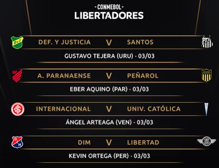 En cuanto a los clubes paraguayos, Libertad visitará al DIM de Aldo Bobadilla y dicho encuentro será arbitrado por Kevin Ortega de Perú.