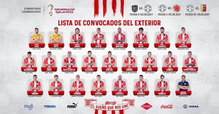 El entrenador argentino de la selección paraguaya dio a conocer la lista de 24 jugadores que se desempeñan en el exterior para el combo de eliminatorias donde Paraguay tendrá que visitar a Ecuador y recibir a las selecciones de Colombia y Venezuela en el camino al Mundial de Qatar 2022.