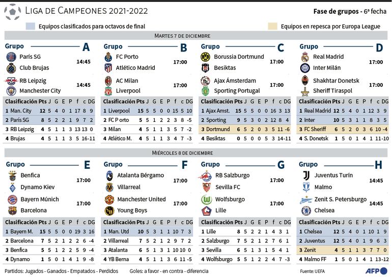Los cinco billetes que quedan para los octavos se disputarán entre hoy y mañana. Once clubes ya se han clasificado para la fase de eliminación directa que comenzará en febrero: Manchester City. PSG, Liverpool, Ajax, Sporting Lisboa, Real Madrid, Inter de Milán, Bayern Múnich, Manchester United, Chelsea y Juventus.