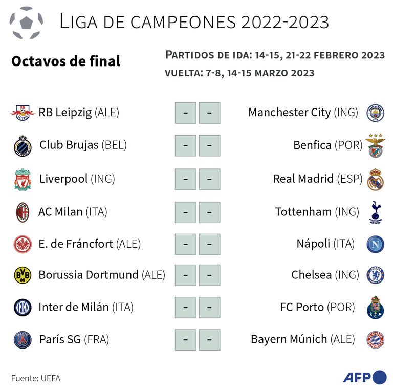 El Manchester City, que sigue a la caza de su primera corona en el máximo certamen de la UEFA, se enfrentará al Leipzig, mientras el AC Milan recibirá al Tottenham antes de viajar a Inglaterra.