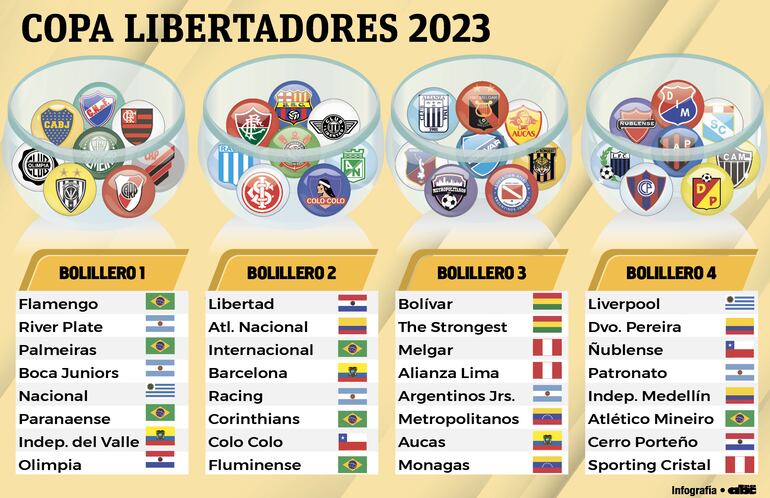 De los 32 clubes que tomarán parte de la fase de grupos, siete son brasileños y cinco argentinos. Con tres representantes se anotan Paraguay, Colombia, Ecuador y Perú y los restantes con 2.