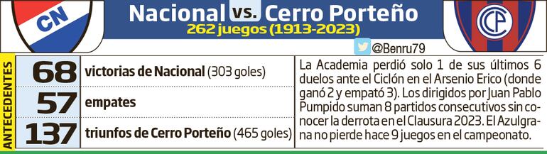 Cerro Porteño cruzará la vereda para enfrentar a su vecino, Nacional, en un duelo en el que estará en juego el subcampeonato para el visitante y el de seguir peleando por un cupo a la Copa Libertadores del año próximo para el local.