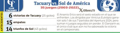 * Probable equipo de Tacuary: Héctor Espínola; Alexis Fernández, Marcos Cáceres, Helerson Mateus y Walter Clar; Derlis Rodríguez, Nelson Acevedo, Víctor Ferraz y Óscar Ruiz; Néstor Camacho y Darío Lezcano. D.T.: Vinícius Soarez Eutrópio.