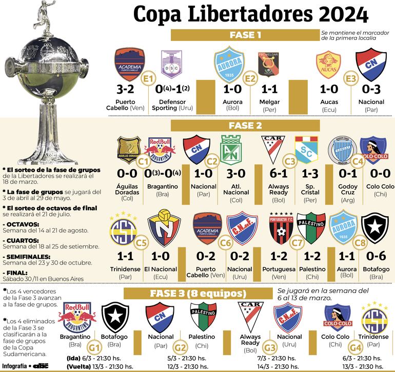 Después de eliminar al Aucas (Ecuador) y Atlético Nacional (Colombia), en la Fase 1 y 2, respectivamente, Nacional sube otra vez mañana al escenario de la Copa Libertadores buscando llegar a la llave de grupos y enfrentará a Palestino de Chile, en el Defensores del Chaco, a las 21:30, con el arbitraje del venezolano Jesús Valenzuela.