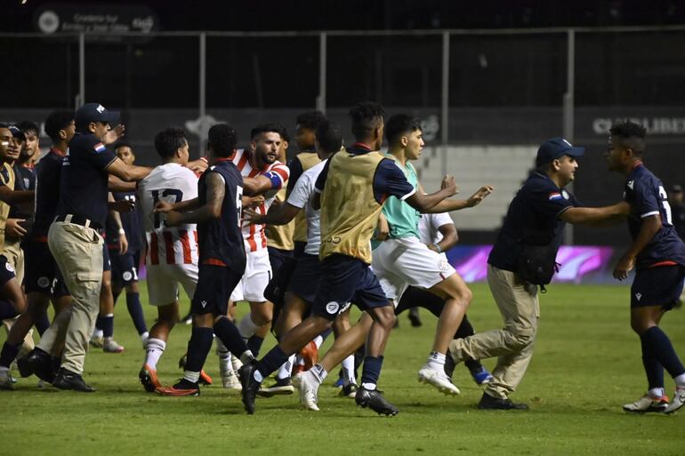 La acción, que desató la trifulca, tuvo como protagonista a Kevin Parzajuk, quien en un forcejeo terminó en el suelo, combinando su movimiento de caída con un taponazo al rostro del defensor rival, cuya banca de suplentes salió a la protesta, produciendo así la pelea que tuvo golpes y discusiones entre los jugadores y los miembros del staff, hasta que tuvo que intervenir la Policía para que finalmente Ibai Gómez decida retirar a su equipo del campo y dar por concluido el “amistoso”.