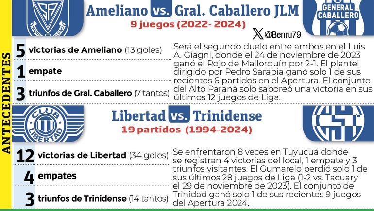 En el cuadro de Mallorquín se dará el debut de Aureliano Torres como técnico, quien tomó la posta luego de la salida de Héctor Ponce. Tanto la V azulada como elenco Rojo vienen de un tropiezo la fecha pasada. Ameliano fue goleado 3-0 por Cerro Porteño, mientras que General Caballero JLM cayó 2-1 frente a Nacional.