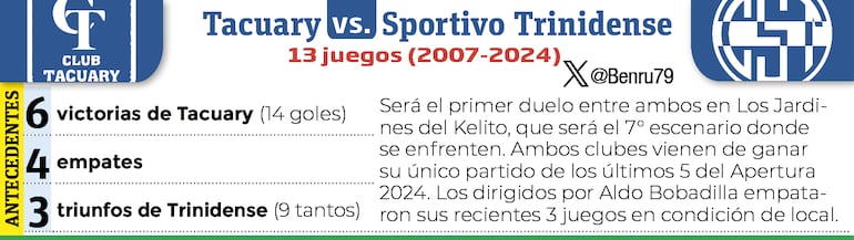 A las 19:30, Tacuary recibe a Sportivo Trinidense, un encuentro en el que se medirán dos equipos que están atravesando por dos realidades muy distintas.