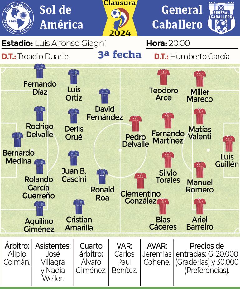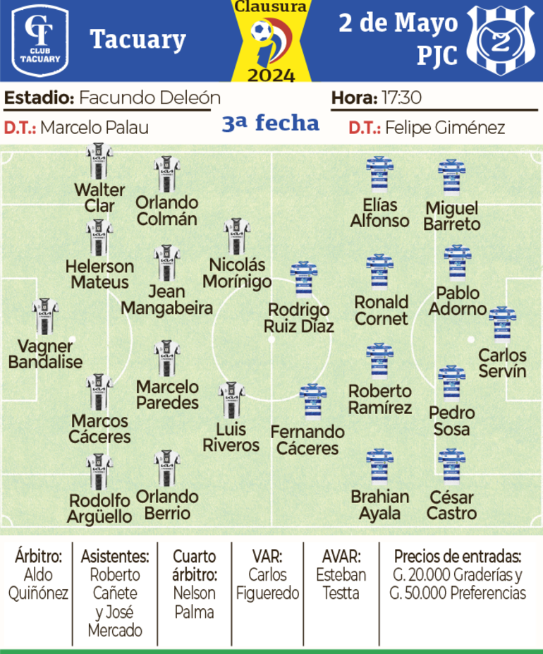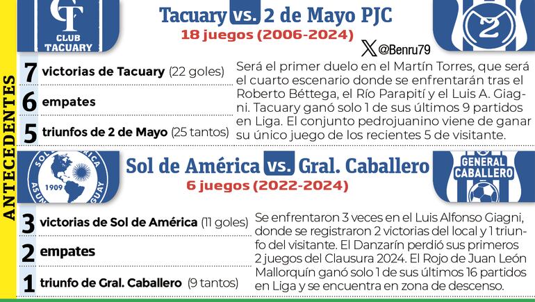 El primer encuentro se disputará a las 17:30 en el estadio Martín Torres, cuando Tacuary reciba al 2 de Mayo PJC, mientras que el segundo será a las 20:00 en el Luis Alfonso Giagni, donde Sol de América se medirá a General Caballero JLM.