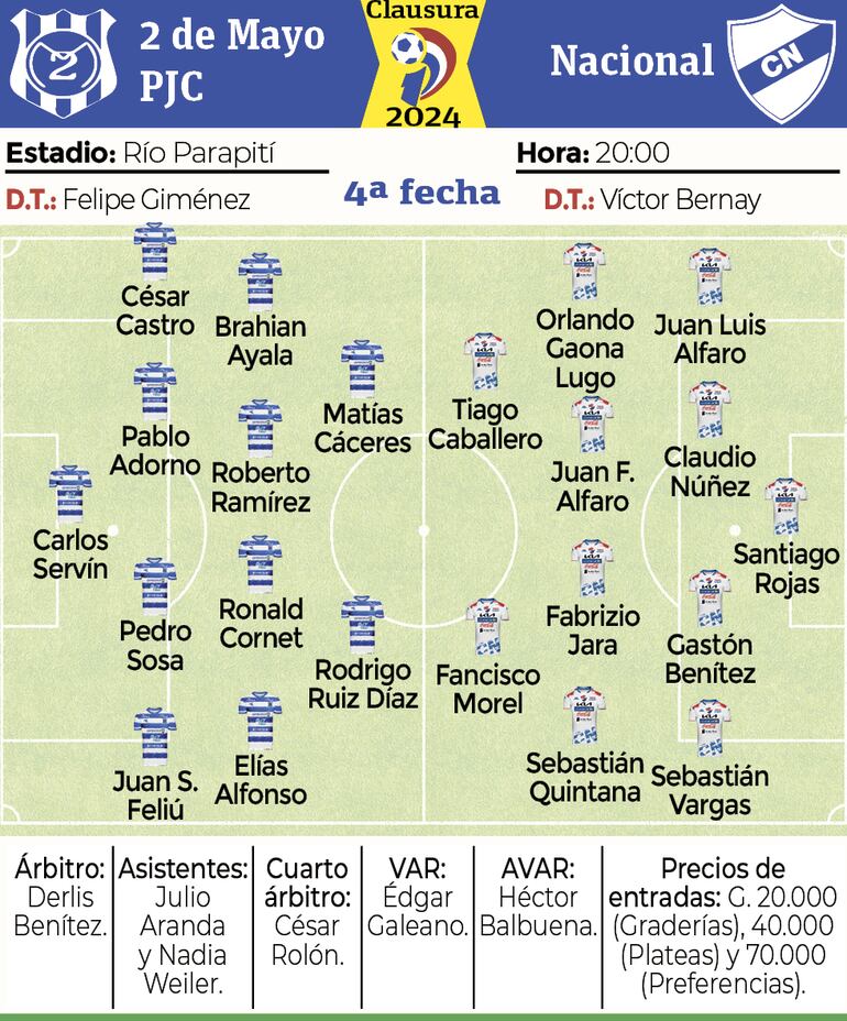 La cuarta fecha del torneo Clausura 2024 del fútbol paraguayo disputa hoy dos partidos en la continuidad de la cuarta ronda. En el segundo encuentro del día, posterior a Sportivo Ameliano vs. Guaraní, el 2 de Mayo enfrenta a Nacional en el estadio Río Parapití de Pedro Juan Caballero: empieza a las 20:00, con el arbitraje de Derlis Benítez y el VAR de Édgar Galeano.