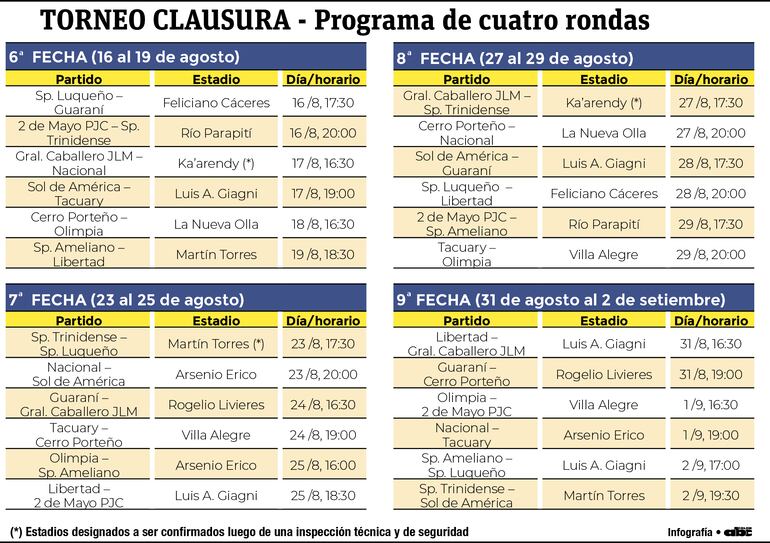 Tacuary confirmó que hará de anfitrión de Cerro Porteño (en la 7ª fecha) y Olimpia (en la 8ª), respectivamente en la continuidad del cargado calendario que también comprende el segundo adelanto (la octava) de los cuatro que se marcaron.