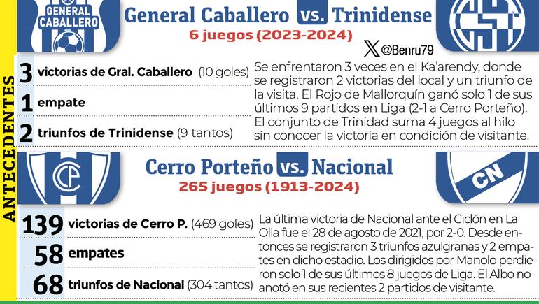 Un necesitado General Caballero, que sigue estancado en la zona roja del promedio, recibe en el Ka’arendy a un Sportivo Trinidense que dio un salto importante en la tabla con su victoria 3-2 ante Luqueño la fecha pasada. Para este duelo, el técnico José Arrúa pierde a sus dos laterales titulares y tiene a uno de sus centrales en duda. Armando Ruiz Díaz en lugar de César Benítez, Wildo Alonso por Sergio Mendoza y la incógnita, si arranca David Villalba o Gilberto Flores.