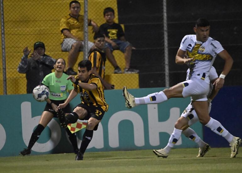 Adrián Alcaraz es amonestado por falta sobre Marcos Riveros