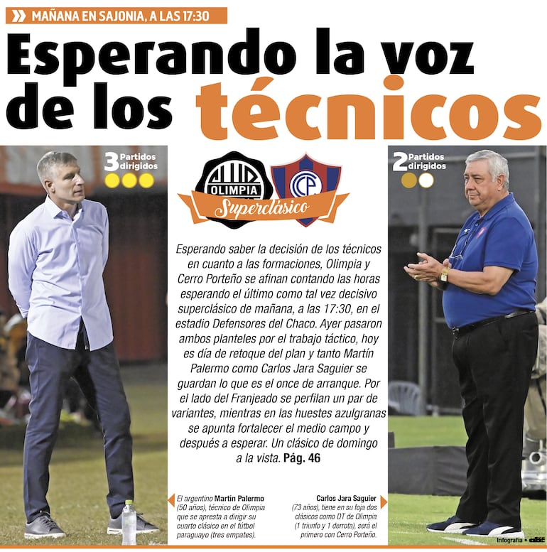 A las 17:30, con el Defensores del Chaco colmando por hinchas franjeados, se espera el último tradicional duelo del año. En la formación de Martín Palermo se meten César Olmedo por Carlos Espínola y Lucas Pratto en lugar de Hugo Fernández. A la espera de la voz del técnico, se especula que Derlis podría arrancar en el puesto de Erick López, a diferencia del cuadro que arrancó el juego contra Libertad.