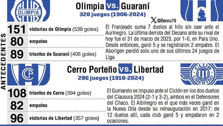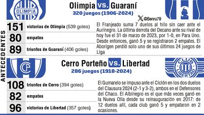 A las 18:15, en el estadio Defensores del Chaco, se cruzarán Olimpia y Guaraní, en una nueva edición del añejo clásico paraguayo. Y si fuera poco este atractivo enfrenamiento, después, a las 20:45, en La Nueva Olla, Cerro Porteño tendrá la visita de Libertad, colgada en el cuello la medalla de supercampeón.