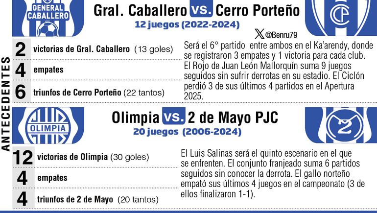 El necesitado Cerro Porteño se presentará en Juan León Mallorquín para enfrentar a General Caballero, a las 18:15, mientras que Olimpia oficiará de local en Itauguá para su duelo contra el Sportivo 2 de Mayo, marcado para las 20:30.