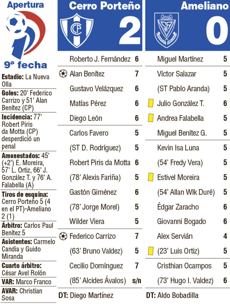 A poco de iniciarse el segundo tiempo, Cerro llegó al segundo mediante una gran maniobra de Alan Benítez que tuvo una brillante asistencia de taco de Cecilio para la culminación de la acción del marcador de punta con tiro cruzado.