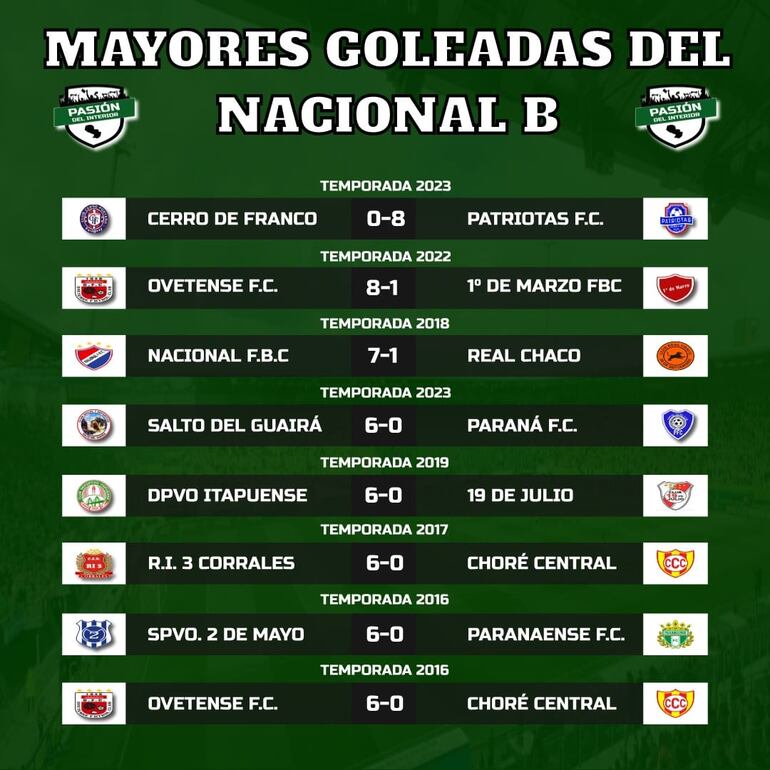 * Grupo B. Cerro Porteño (Presidente Franco) 0 vs. Patriotas FC (Hernandarias) 8, en el estadio Felipe Giménez, en Presidente Franco; hoy (14:45). Guaraní de Trinidad (Itapúa) vs. Nacional (Salto del Guairá), en el estadio Los Fundadores, en Trinidad; Ovetense (Coronel Oviedo) vs. R.I. 3 Corrales (Ciudad del Este), en el estadio Ovetenses Unidos, en Coronel Oviedo. Clasificación: Patriotas 25 puntos, Ovetense 16, R.I. 3 Corrales 15, Nacional SDG 15, Cerro de Franco 5 y Guaraní de Trinidad 1.