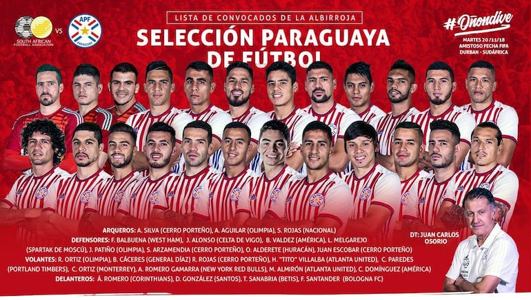 Defensas Fabian Balbuena (West Ham), Junior Alonso (Celta), Bruno Valdez (América), Lorenzo Melgarejo (Spartak Moscú), Juan Patiño (Olimpia), Santiago Arzamendia (Cerro Porteño), Omar Alderete (Huracán) yJuan Escobar (Cerro Porteño).