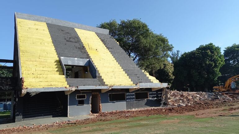 Guaraní demolió hoy el famoso “tobogán” del Rogelio Silvino Livieres. El club había empezado la demolición de las graderías para la construcción del nuevo estadio, pero había dejado en pie la peculiar estructura ubicada en la zona de Preferencia. El Aborigen realizó un evento con la presencia de los medios para derribar por completo el antiguo escenario.