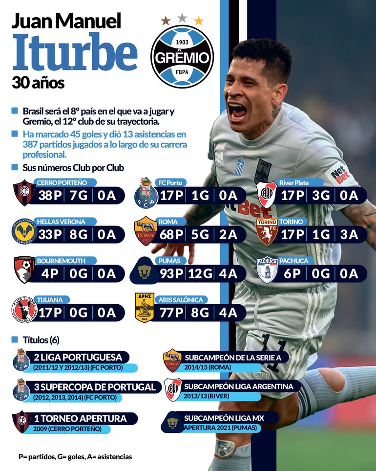 Grêmio, donde juega actualmente el mediocampista paraguayo Mathías Villasanti, anunció que el vínculo de Iturbe con el equipo gaùcho será hasta diciembre de 2023, con opción a renovación por otra temporada.