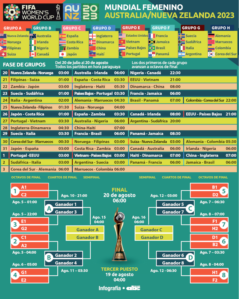 En el partido inaugural, Nueva Zelanda recibirá a Noruega a las 19H00 local (03:00, hora paraguaya) en el Eden Park de Auckland, un monumental estadio de rugby con capacidad para 50.000 espectadores que fue adaptado para albergar este torneo.