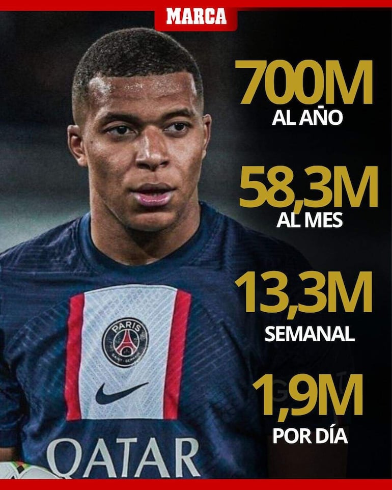 Al margen de esta oferta, el Al Hilal le ofrece a Mbappé un contrato de un año con un salario neto de 700 millones de euros. Desglosando los 700 millones, el club saudí le pagaría a Mbappé si se decidiera a jugar allí, casi 2 millones al día (1,9 millones).