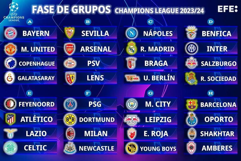 El Manchester City, vigente campeón de Europa, tiene un grupo en teoría accesible, contra RB Leipzig, Estrella Roja y Young Boys, mientras que Bayern Múnich y Manchester United serán claros favoritos en el grupo A, frente a Copenhague y Galatasaray.