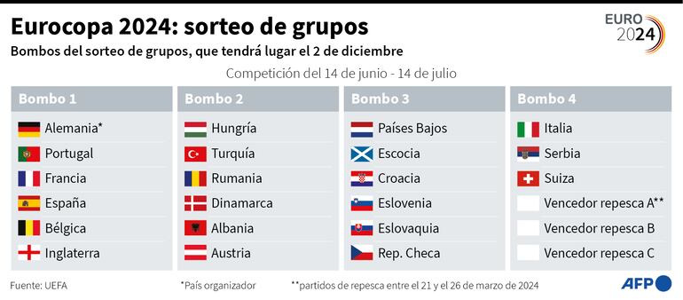 Todos los grandes de Europa estarán presentes en la cita, y la gran mayoría de ellos se hallan en el bombo 1 (la Francia de Kylian Mbappé, la Inglaterra de Harry Kane y Jude Bellingham, el Portugal de Cristiano Ronaldo, España, Bélgica y la anfritriona Alemania).