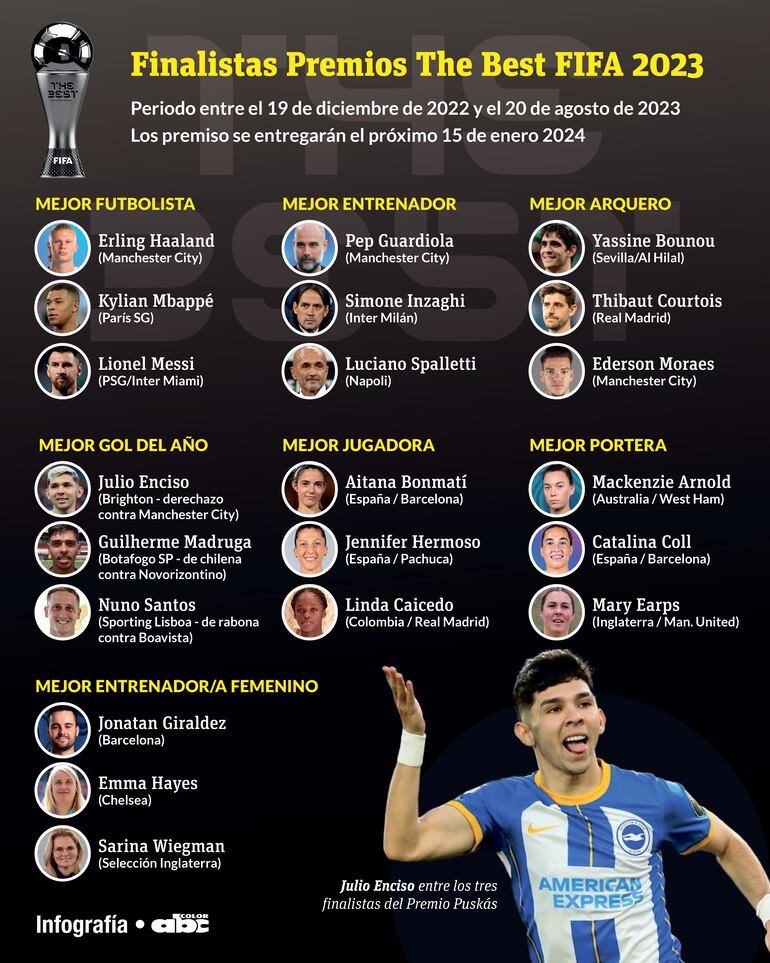 Los tres jugadores fueron designados teniendo en cuenta las actuaciones entre el 19 de diciembre de 2022, un día después de la final del Mundial de Qatar, y el 20 de agosto de 2023.