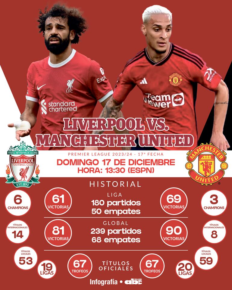 * Cada uno reclama la supremacía histórica: El United, en el ámbito local, por sus 59 títulos nacionales y sus 20 títulos de liga, por encima de los 53 títulos y 19 ligas del Liverpool; y los “Reds” por sus 14 títulos internacionales, por sobre los 8 del United, y por ser más veces campeón de Europa; seis contra tres. En total, Liverpool y Manchester United tienen 67 títulos cada uno.