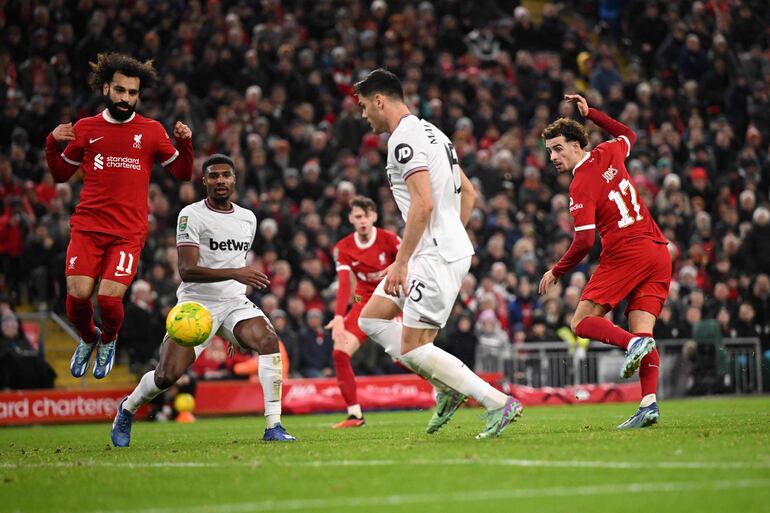 En una exhibición de los Reds, marcaron Dominik Szoboszlai (28) , Curtis Jones (56 y 84) , Cody Gakpo (71) y Mohamed Salah (82) . Jarrod Bowen (77) logró el gol del honor para el West Ham, actual octavo de la Premier League.