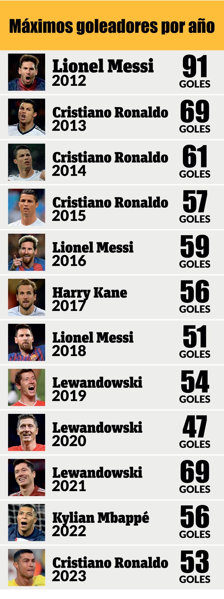 Cristiano Ronaldo ya superó este año en la tabla de artilleros a jugadores de la talla de Kylian Mbappé y Harry Kane, quienes acumulan 52 goles cada uno, en 53 y 57 partidos disputados respectivamente, pero que ya no tienen competencia en lo que resta del año.
