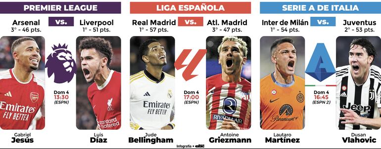 Domingo: 08:30 Torino-Salernitana (ESPN2); 11:00 Napoli- Hellas Verona; 14:00 Atalanta-Lazio (ESPN3); 16:45 Inter-Juventus (ESPN2).