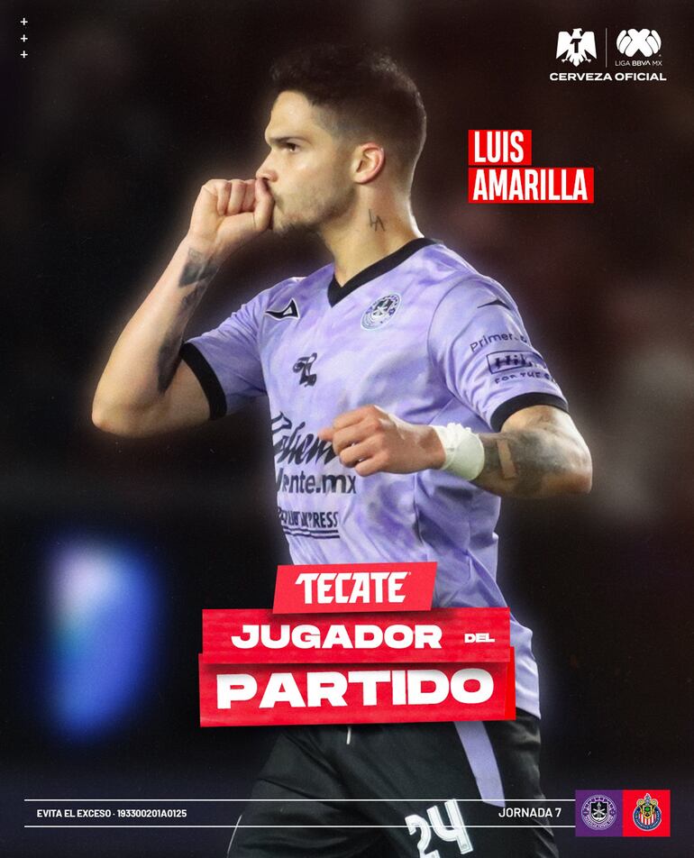 Al 87, el portero del Guadalajara José Rangel falló en una salida aérea y dejó la pelota servida para que Amarilla hiciera el 2-1 para el Mazatlán con un zurdazo dentro del área. Ya en tiempo agregado, al 90+10, Amarilla apareció otra vez en el área y firmó el 2-2 con un potente disparo.