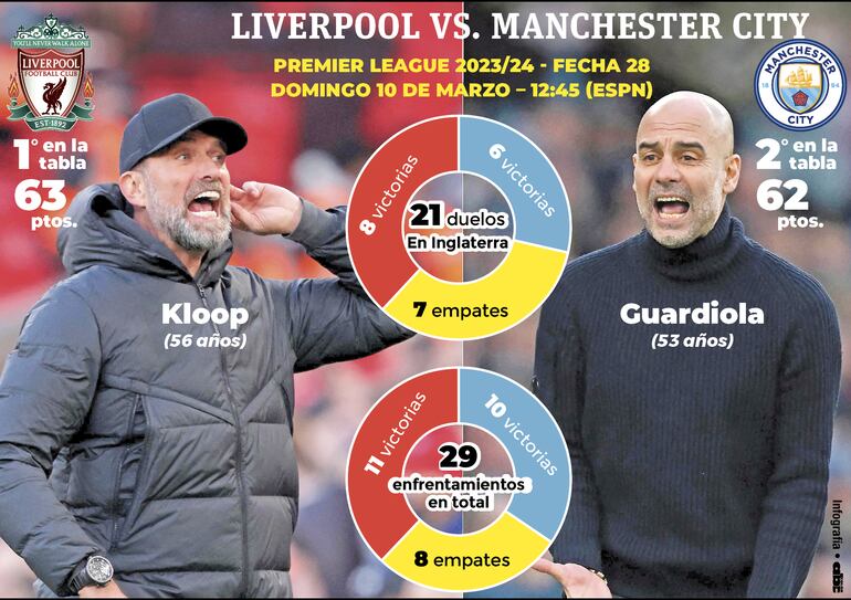 Un punto separa apenas a ambas formaciones en la clasificación inglesa. Es el Liverpool quien está por delante, por lo que una victoria le permitiría abrir hueco en la tabla, mientras que el City necesitaría la victoria en Anfield para ponerse en el primer lugar.