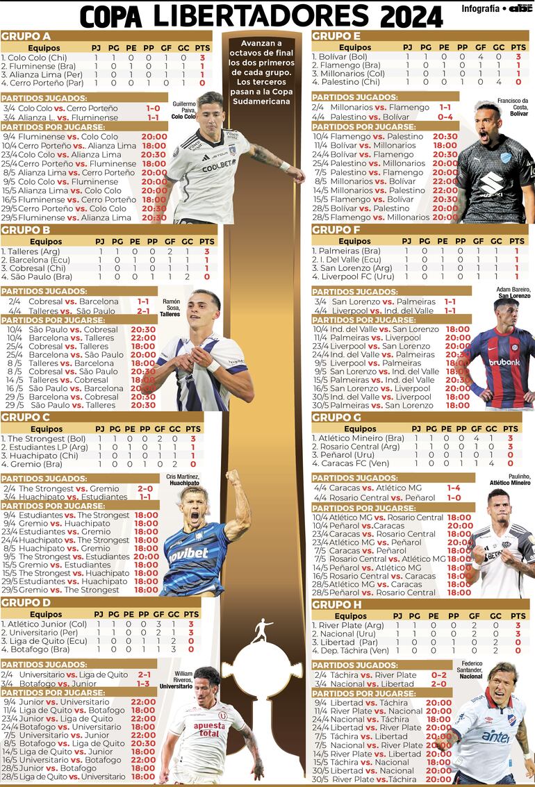 20:00 Libertad vs. Táchira, en Asunción. Árbitro: Andrés Rojas (Col).