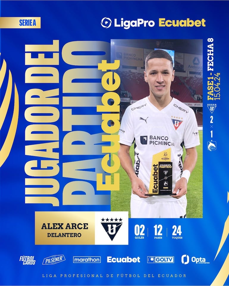 Arce aprovechó una asistencia de Michael Estrada para anotar el primero del partido con un remate desde corta distancia, y el segundo lo hizo con un penal. Liga, que tiene dos partidos pendientes diferidos, suma 15 puntos en la tabla, que lidera Aucas con 17 unidades.