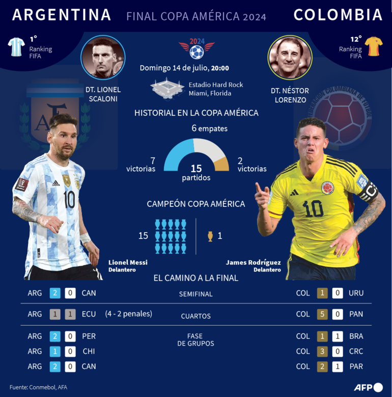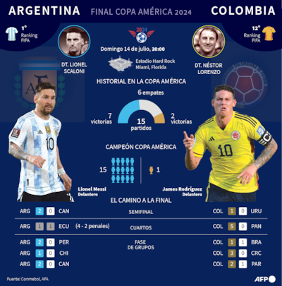 No es lo único en lo que se diferencian los dos finalistas en cuanto a juego de ataque. Según datos de BeSoccer para la agencia EFE, Argentina ha hecho más tiros que Colombia (68 por 53) y también más disparos a puerta (29 por 21) .